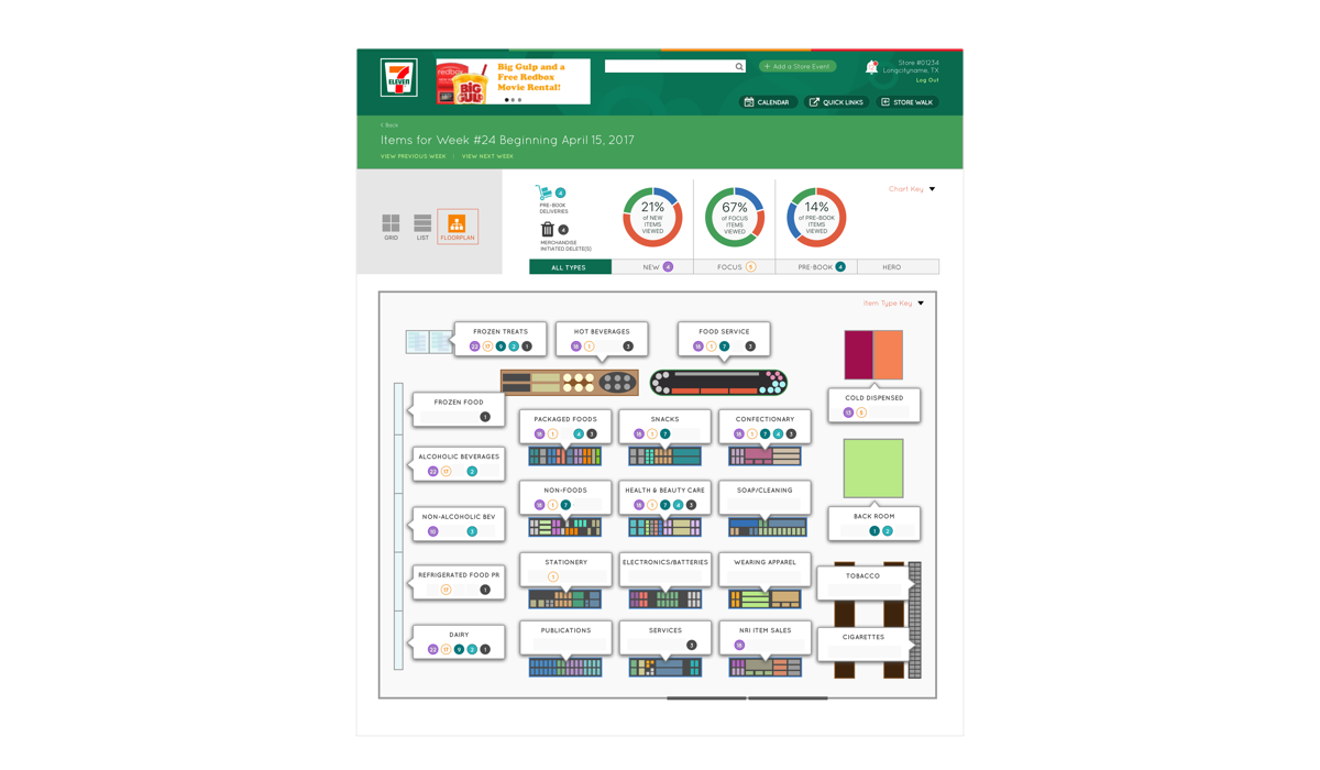 Desktop view of the dashboard and store layout summary depicting counts for different inventory types (New, Focus, Pre-book, Hero).