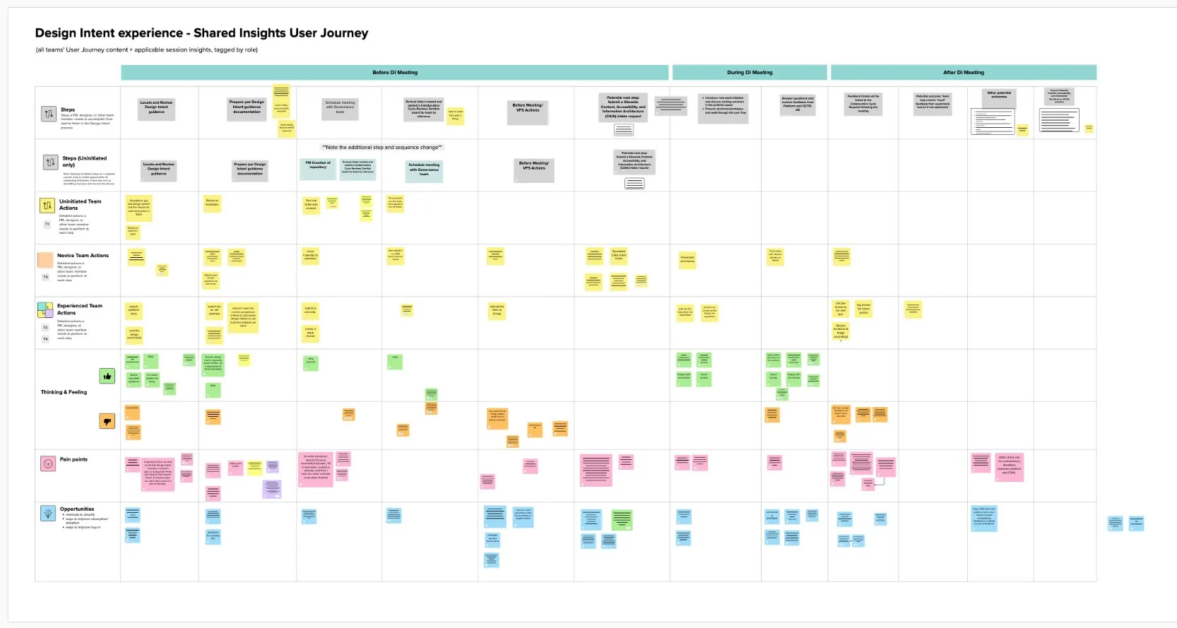 Insights from our team synthesis exercise were grouped and added to a Shared Insights User Journey to depict patterns, common themes, and opportunities for improvement at each step.